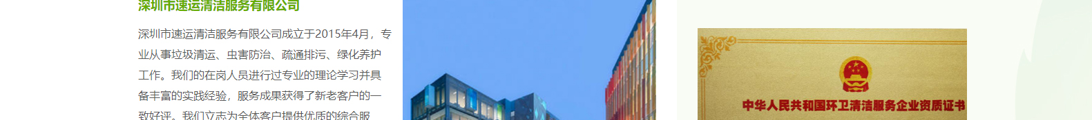 深圳市速运清洁服务有限公司成立于2015年4月,专业从事垃圾清运、虫害防治、疏通排污、绿化养护工作。我们的在岗人员进行过专业的理论学习并具备丰富的实践经验,服务成果获得了新老客户的一致好评。我们立志为全体客户提供优质的综合...